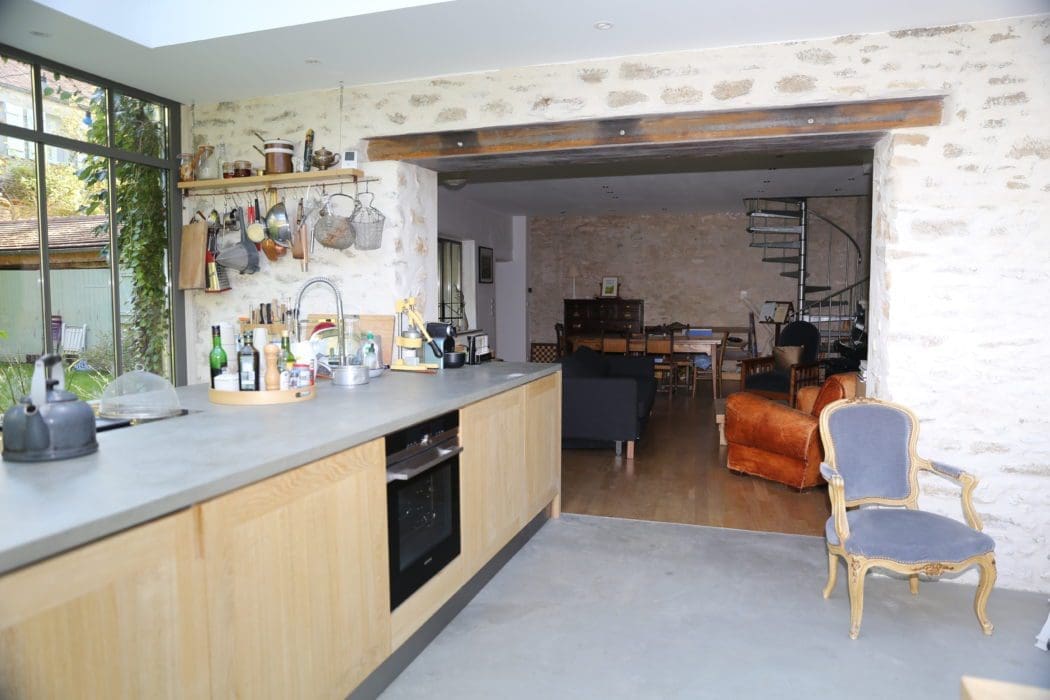 Extension-véranda abritant une cuisine avec coin repas, toiture composée d’un terrasson et d’une verrière centrale apportant beaucoup de lumière dans ce nouvel espace et dans le salon de la maison existante. 3 000 à 3500 € le m2, Arehal.