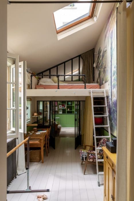 Deux couchages en mezzanine ont pu être créés grâce à la belle hauteur sous plafond de la pièce, à des cloisons vitrées hautes et basses et à l’abaissement du sol. Réalisation de l’architecte Camille Hermand.