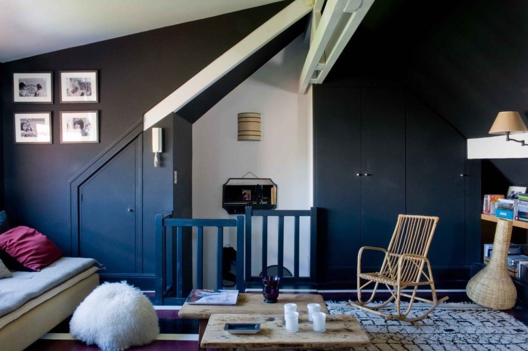 Parti pris foncé pour la rénovation de ces combles avec une peinture bleu nuit contrebalancée par des meubles en bois clairs et de nombreux coussins. Réalisation studio architecture et décoration d’intérieur Maison Sarah Lavoine.