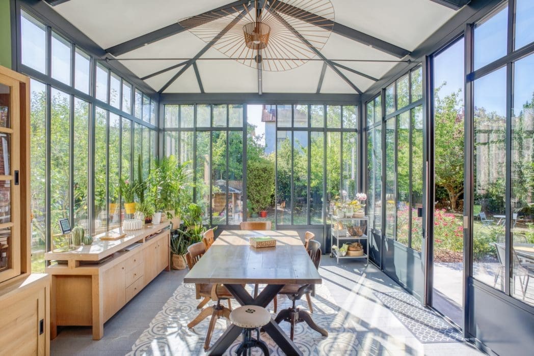 Véranda en acier sur mesure à rupture de pont thermique, traitement anti-humidité appliqué sur les profilés, vitrages chauffants réglés par télécommande. 3 500 €/ m2 selon les équipements de confort choisis, Turpin-Longueville.