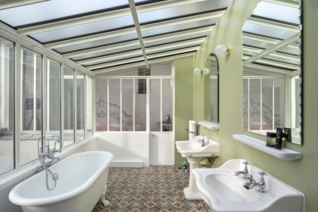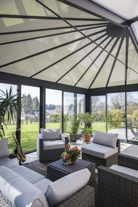 « Tourmaline », véranda en aluminium avec chevrons en épines, affleurant côté intérieur et laissant apparaître les profilés côté extérieur, ouvertures coulissantes en châssis à ouvrants cachés et rails encastrés. Prix sur demande, Technal.