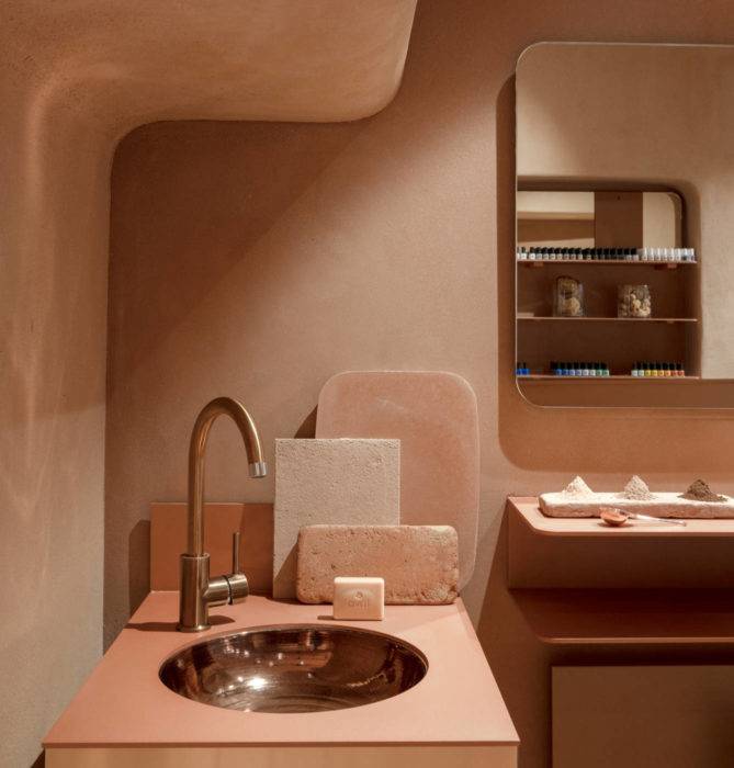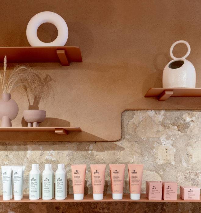 Sollicités par la maison de cosmétiques bio Avril pour habiller leurs boutiques parisiennes (quartier des Halles, gares Montparnasse et de Aéroville), Anne-Cécile Comar et Philippe Croisier de l’Atelier du Pont ont parié sur trois éléments biosourcés. Ils ont en effet choisi une matière par lieu, terre crue, liège et fibres végétales, tout en déclinant la même gamme de couleurs, du nude au taupe, de l’ocre au sable.