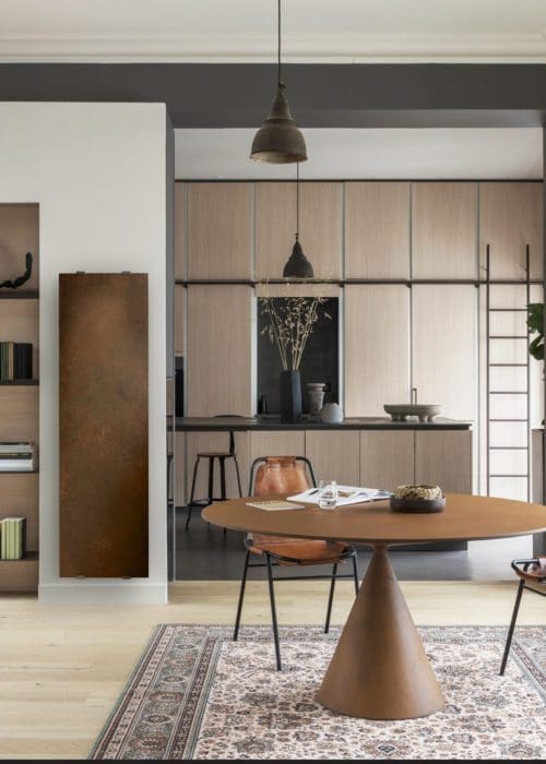 03 – à effet. Radiateur avec façade en céramique finition effet rouillé, restitue doucement la chaleur, technologie Muller Intuitiv permettant de réduire la consommation de 30 % en traquant la moindre source de gaspillage. « Keramos », à partir de 1 550 € TTC, Campa.
