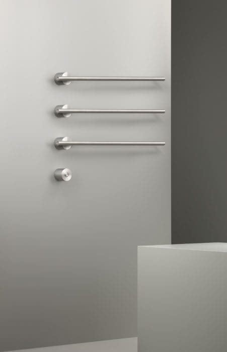 Ce sèche-serviettes ou sèche-peignoir en inox est un système modulaire composé d’un ou plusieurs éléments installés verticalement ou horizontalement. Alimenté par énergie électrique à bas voltage, selon les principes d’économie énergétique de la production CEA, il est disponible dans les finitions standards, satinée et polie, et de nombreuses finitions spéciales. « Equilibria », modèle déposé, design Natalino Malasorti, 2 869 € HT, CEA Design.