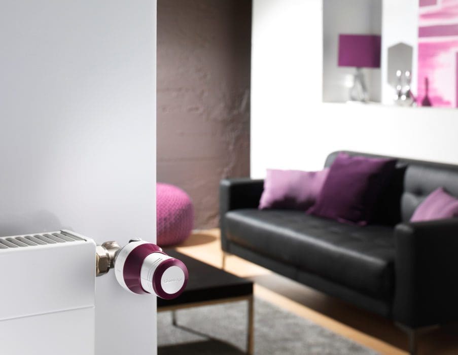 12 – Coordonné. Tête thermostatique avec kit de personnalisation de couleur (16 couleurs au choix), réagit très rapidement aux variations de température, jusqu’à 15 % d’économies d’énergie par rapport à un radiateur manuel, « Senso », environ 36 €, Comap.