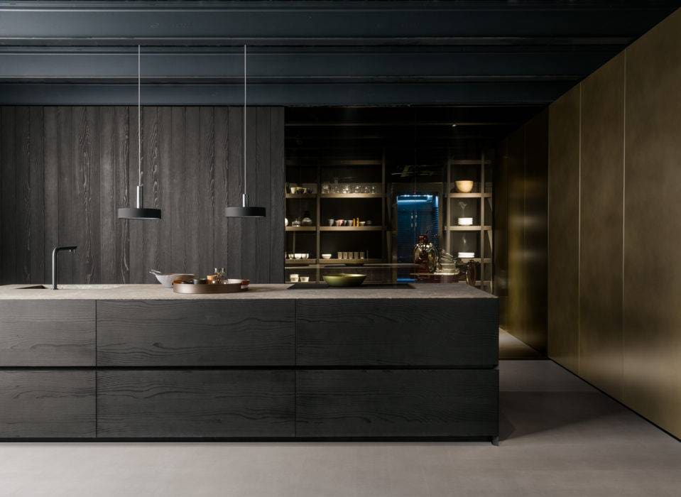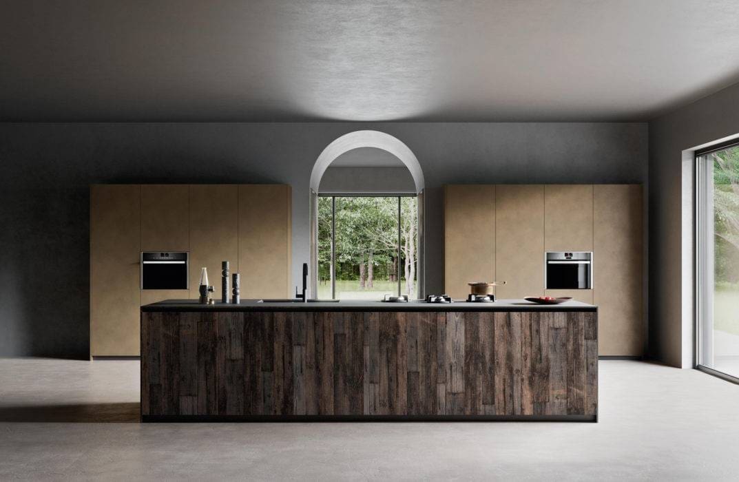 Cette cuisine porte une attention spéciale aux matériaux, comme cette finition vieux bois obtenue avec des essences datant de 80 à 100 ans, récupérées sur les parties extérieures de chalets et de refuges de montagne, « K105 », Zecchinon.