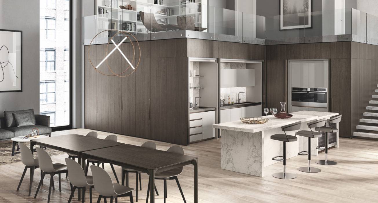 Ce programme d’agencement imaginé par Rainlight Studio permet de meubler tout type de pièce d’une façon à la fois organisée et fonctionnelle, comme ici la cuisine cachée derrière des portes escamotables et son salon attenant. « BoxLife », Scavolini.