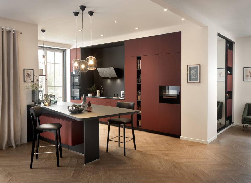 Mariage heureux et belle unité entre ce ton terracotta appelé Sirra et le Caneo, une teinte sombre et profonde. Résultat : l’ensemble produit une impression de raffinement que renforce l’îlot aux astucieux et discrets rangements côté salon. Cuisine « Dolce Vita », Schmidt.