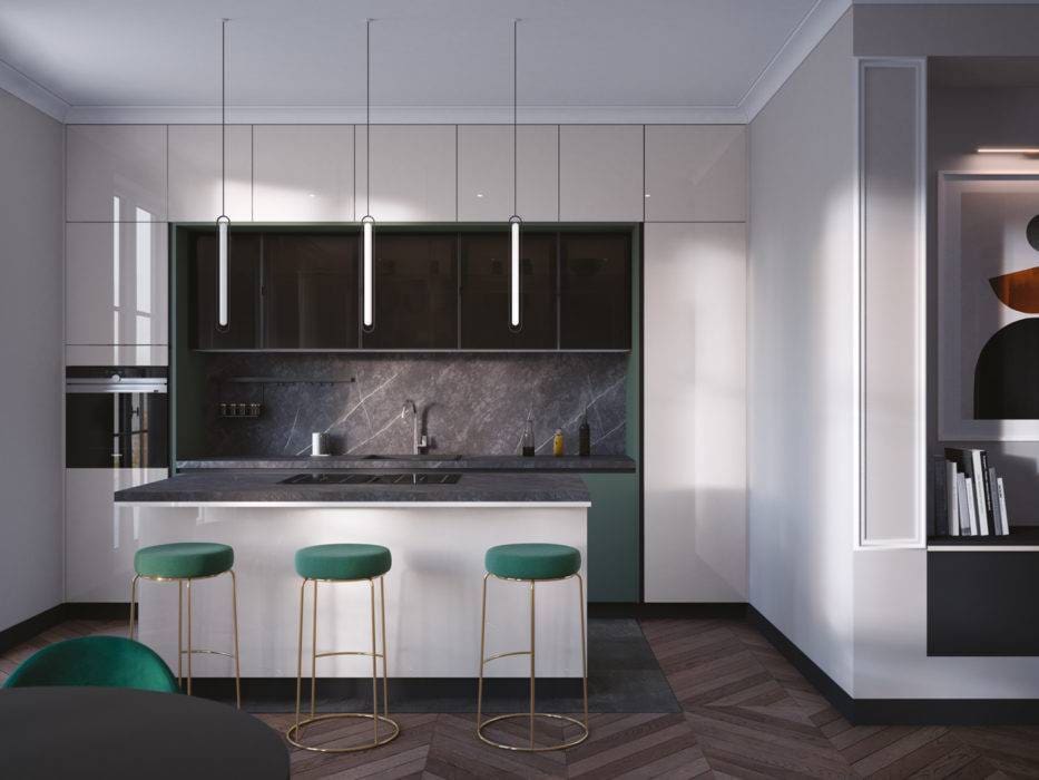 La sophistication est à l’honneur dans cette cuisine qui valorise le savoir-faire et le style français. L’îlot élégant avec son plan de travail au décor marbre fossile s’oppose à la laque brillante des meubles. Contre le mur, un meuble en Fenix® vert Amiral réveille l’ensemble, « Oro Chic », Arthur Bonnet.