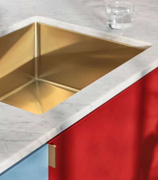 Muller Van Severen imagine une cuisine inspirante qui mélange avec bonne humeur les matières comme le PE-HD pour les façades, utilisé habituellement pour les planches à découper, et les couleurs avec six nuances, mais aussi le laiton pour les poignées et le marbre pour le plan de travail, « Match », Reform.