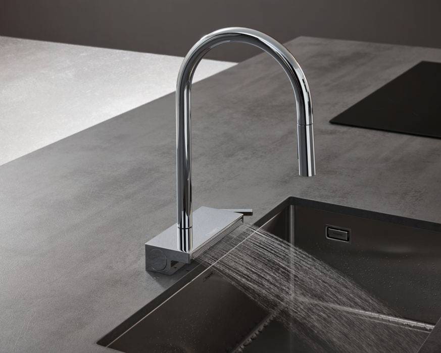 Ce mitigeur de cuisine offre une douchette extractible avec un double jet laminaire ou pluie, mais aussi un jet SatinFlow de 130 micro-buses à la base du corps pour les aliments fragiles, « Aquno Select M81 », 852 €, Hansgrohe.