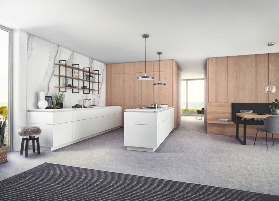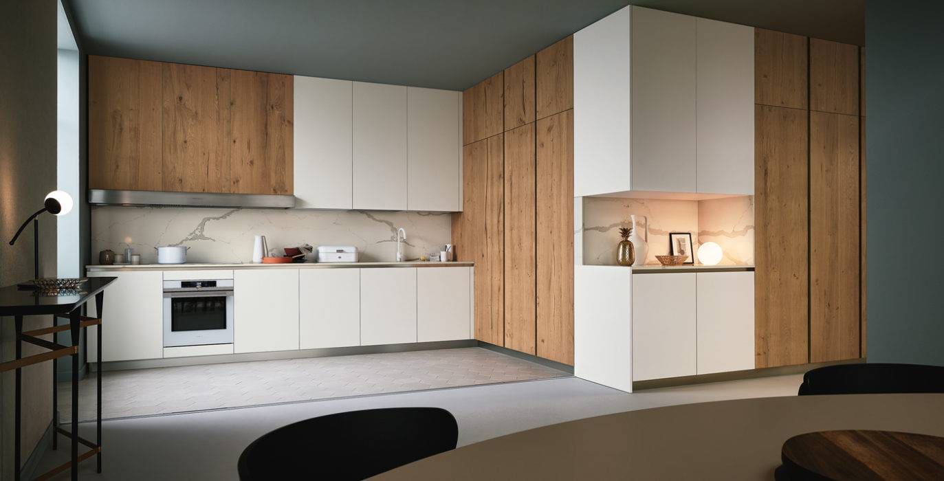 Cette cuisine « Lounge » s’habille d’un superbe plan de travail en quartz Calacatta Soul, de façades en bois Rovere Nodoso Chiaro et du Fenix® Bianco Kos au bel effet mat et toucher velours qui donne de la profondeur à l’ensemble. Veneta
