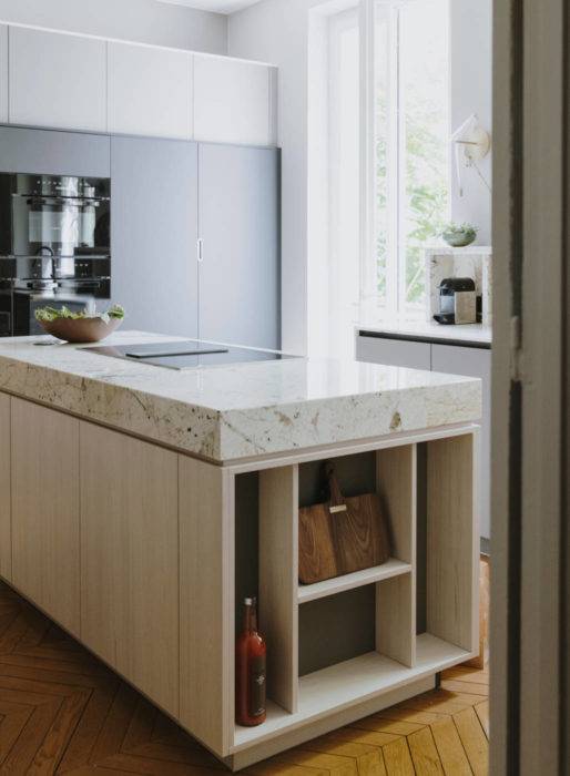 Dans cet appartement haussmannien totalement réaménagé, la cuisine fermée tient une place à part. Son îlot en marbre avec table de cuisson jouxte la partie murale qui accueille avec discrétion l’électroménager. Perene.
