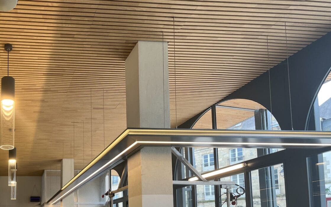 Ce plafond acoustique suspendu est fabriqué à partir de bois de récupération (éléments de charpente inutilisés et destinés à la destruction) issus de gisements français. Le bois est traité pour retarder la propagation des flammes.