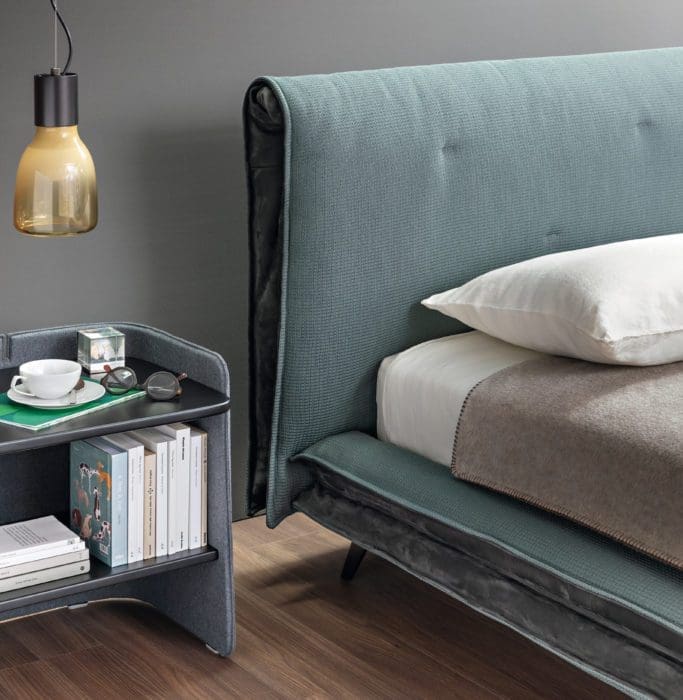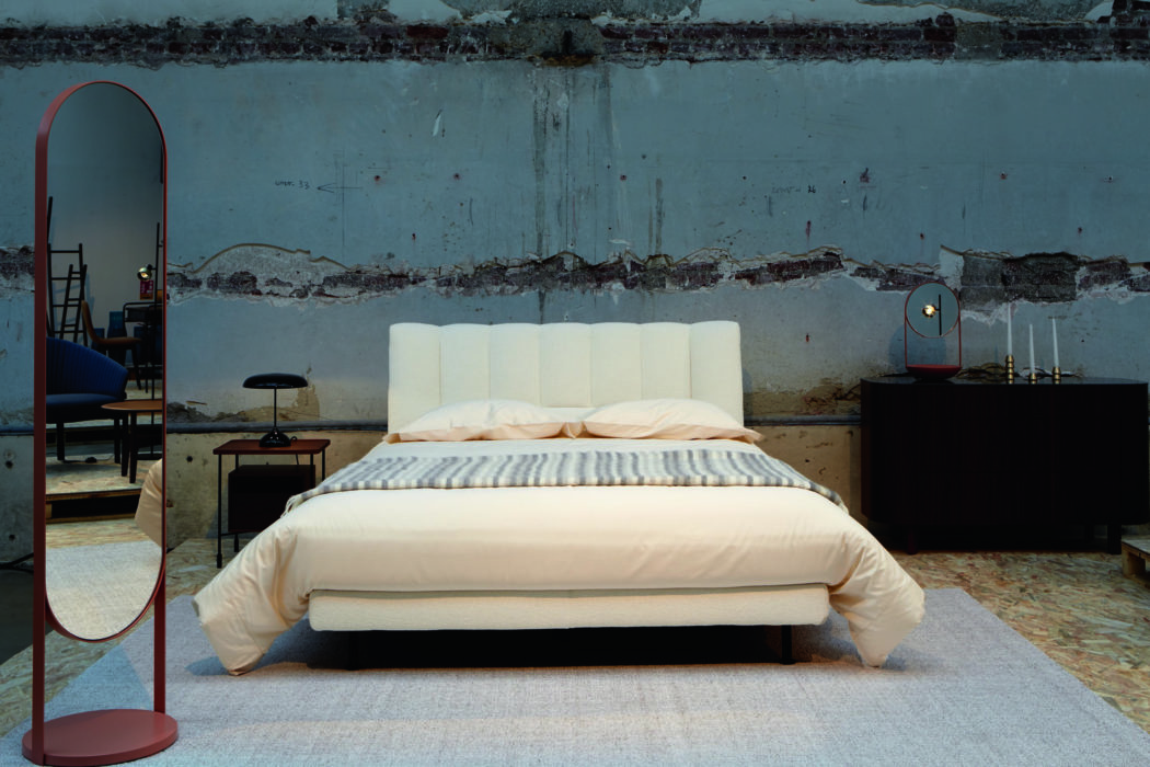 06 – Texturé. Lit « Saddle », revêtement déhoussable en tissu, insert central en cuir, pieds en métal, H100 x L180 x P238 cm (pour un matelas de 160 x 200 cm), design Giuseppe Viganò, à partir de 3 060 €, Bonaldo.