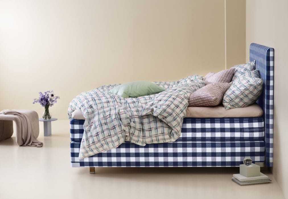 08 – Exclusif. « Lit 2000T », base en pin suédois à croissance lente, 34 couches (crin de queue de cheval, coton, laine et lin) assemblées à la main, 3 systèmes de ressorts distincts, motif Blue Check classique, 160 x 200 cm, 34 390 €, Hästens.