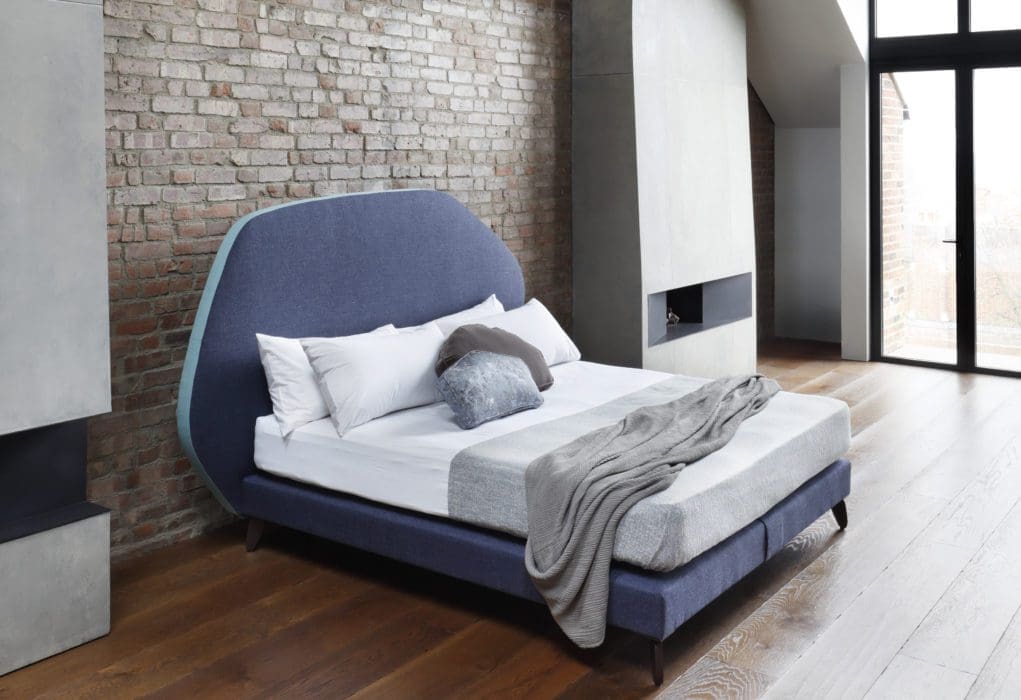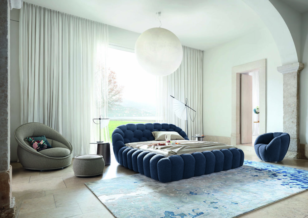 02 – Sculptural. Lit « Bubble », entièrement recouvert de tissu extensible, tête de lit et cadre en mousse bi-densité, piètement en hêtre massif vernis teinté wengé, L202 x H90 x P266 cm (couchage 160 x 200 cm), design Sacha Lakic, 5 430 €, Roche Bobois.
