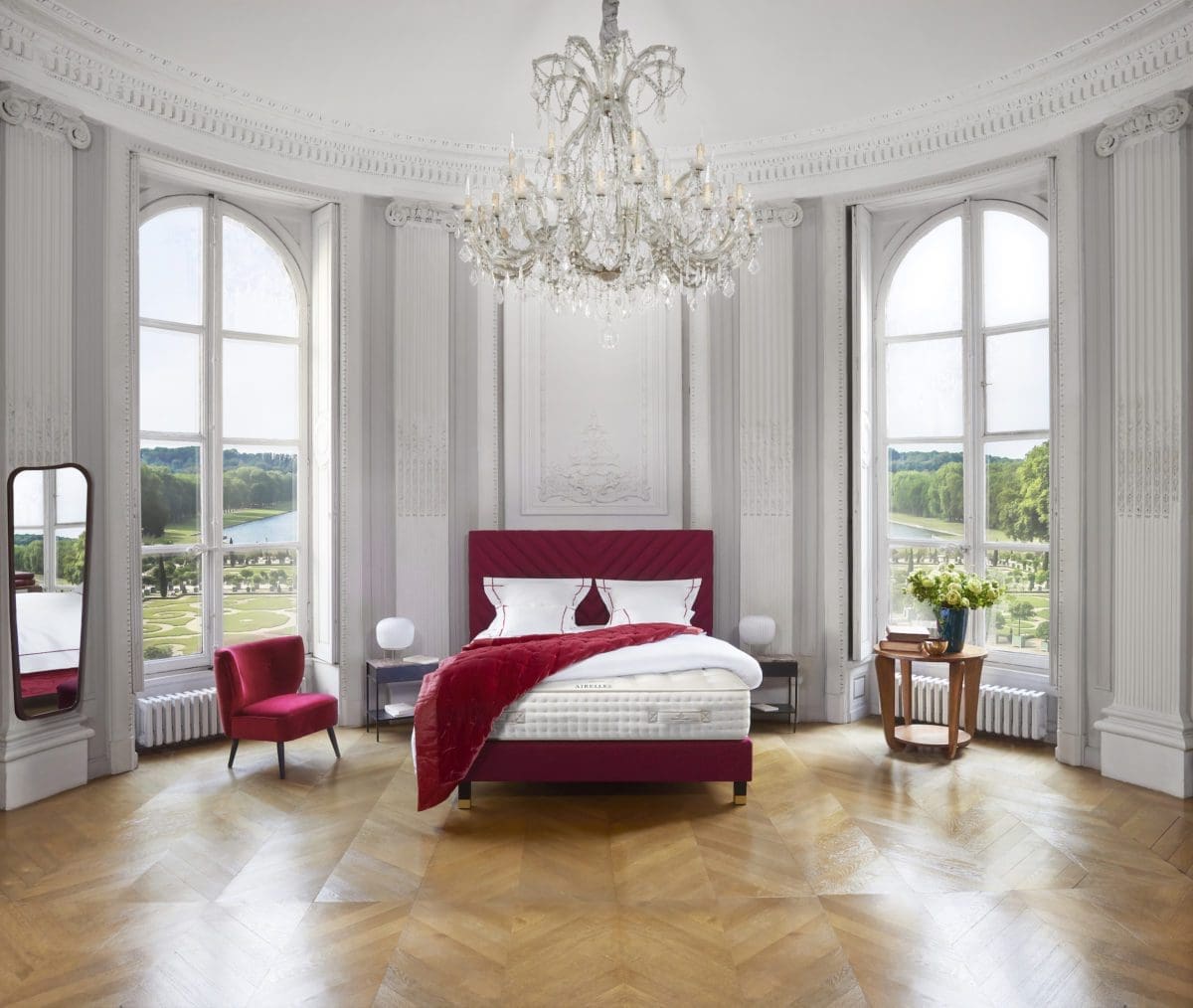 01 – Royal. Matelas « Airelles », conçu pour équiper les chambres de l’hôtel Airelles Château de Versailles, Le Grand Contrôle. Suspensions ensachées Air Spring®, en latex naturel Talalay, laine mérinos d’Arles et lin français, capitonnage intégral à la main et coutil en viscose, soie et cachemire brodé, H32 cm, à partir de 12 000 € en 140 x 200 cm, Tréca.