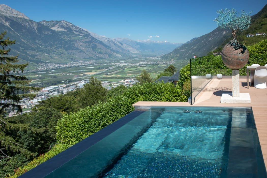 Piscine balnéo à débordement en Inox (100 % recyclable), éclairage à Leds, pompe à chaleur Inverter, volet immergé à lames polycarbonates pour parfaire le chauffage. « Iconix », prix sur devis, Carré Bleu.