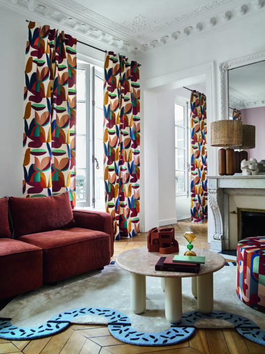Un feuillage stylisé, une palette de couleurs solaires et c’est tout l’espace qui s’anime. Tissu « Flirt » 100 % coton, broderie en polyester et viscose, 229 € le mètre, Casamance.