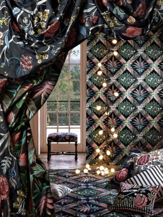 Opulente et richement ornementée, la collection de tissus « Utopia » transporte la maison sous d’autres latitudes. « Feather Park » et « Darius Garden », 260 € et 415 € le mètre, Christian Lacroix Maison pour Designers Guild.