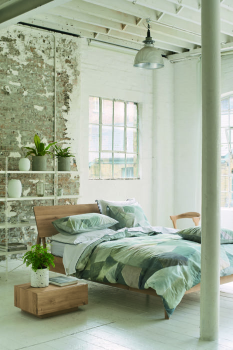 Lignes épurées, teintes aquarelle… l’imprimé patchwork se réinvente en version contemporaine. Collection « Geo Moderne Pewter », en percale de coton, 215 € la housse de couette de 240 x 220 cm, Designers Guild.