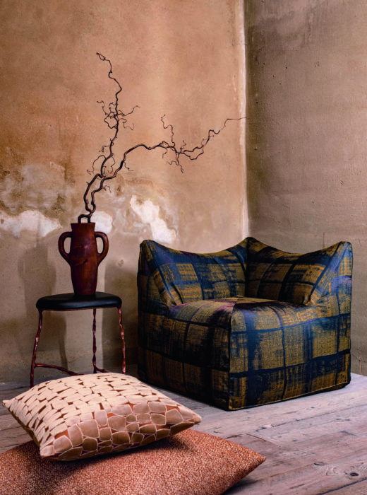 Quand la tendance ethnique chic s’invite sur un fauteuil, le salon gagne en personnalité… et en mystère ! Tissu « Sera », collection « Craft Chic », tissage coton et polyester, 163 € le mètre, Élitis.
