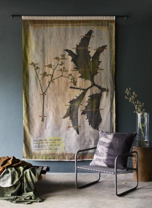 Un herbier du XIXe aux teintes délicatement fanées convoqué sur un panneau en lin fabriqué artisanalement en Afrique du Sud. Motif « Cissus Juttae », 100 % lin brossé, L150 x H220 cm, 519 €, Evolution Product.