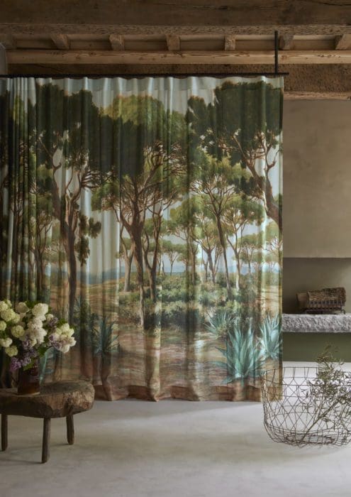 Jeu d’ombre et de lumière sur les pins parasols, les agaves ondulants et, au loin, les reflets bleutés de la Méditerranée… Peint à la main, le tissu panoramique « L’Estérel » traduit toute la beauté des paysages du sud de la France. 100 % lin, L298 x H300 cm, 1533 €, Pierre Frey.