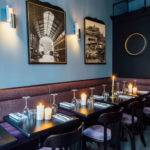 Elliott Barnes remanie les intérieurs chargés de souvenir avec un sens de l’épure qui lui est propre, de sorte à ce que le décor historique soit honoré par la conservation du sol en carreaux de ciment, de la trappe au plafond, du conduit de cheminée du XVIème siècle et des médaillons en forme de losanges sur le bar, et soit réhaussé par des touches de modernité comme le bar d’origine revêti de bois clair et d’étain, les murs habillés d’une teinte mate « steel blue », les appliques créées spécialement par l’architecte, qui encadrent des photographies en noir et blanc des anciennes Halles faisant face à des miroirs teintés et le lustre en perles de métal réalisé à la main qui évoque les années folles.