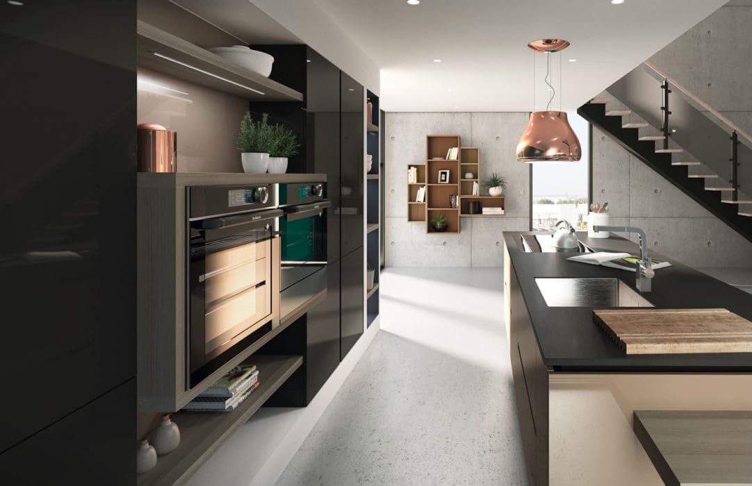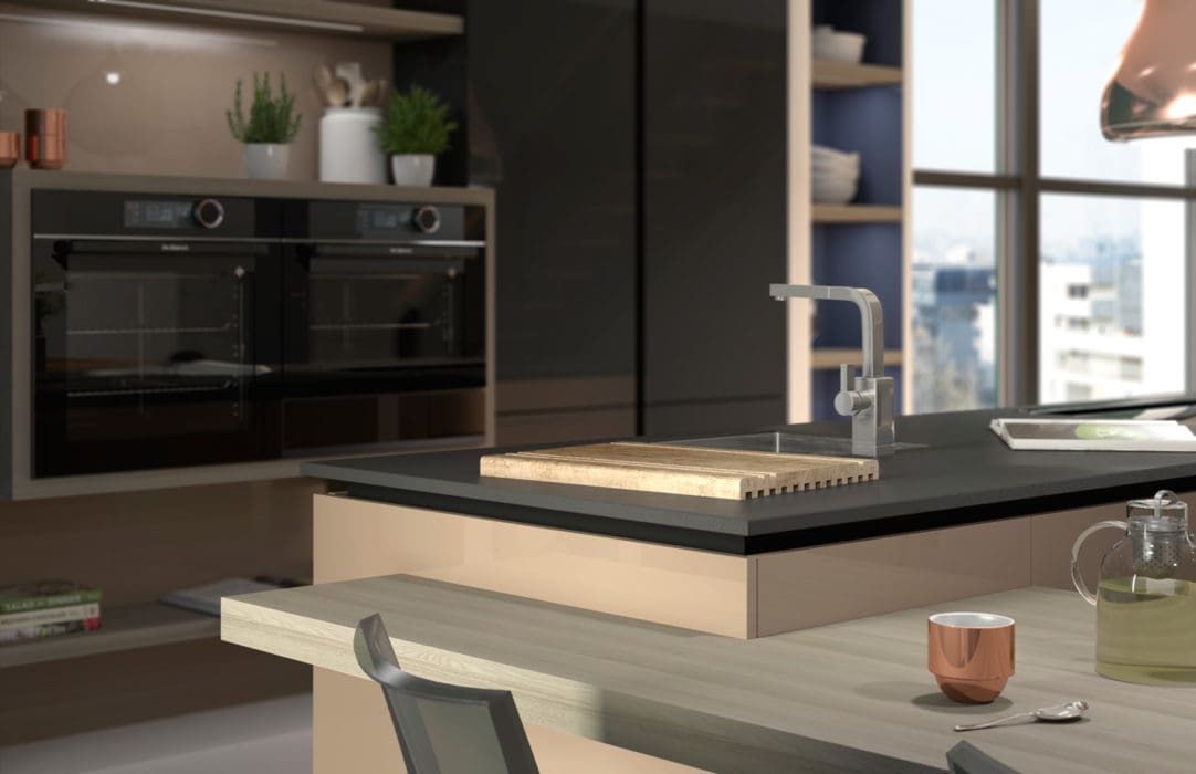 Côté couleurs, on joue sur la sobriété et le minimalisme. La cuisine marie harmonieusement le noisette des façades avec le noir brillant des armoires. Cet accord vient dynamiser le bleu intense des niches qui apporte une touche masculine à la composition. Côté textures et matières, Équinoxe joue entre minéral et végétal, brillant et mat pour créer un univers doux plein de relief. L’espace repas est en frêne albâtre tandis que le plan de travail est en céramique aux teintes grises. Un mariage féminin/masculin très réussi !