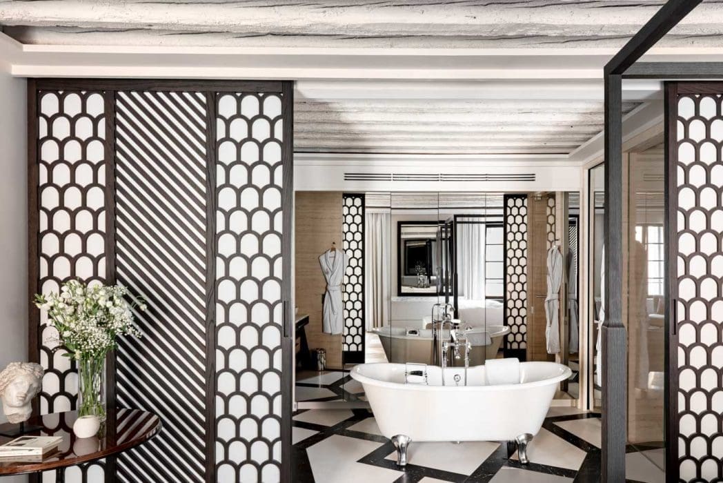Les panneaux coulissants aux dessins géométriques et le sol aux lignes brisées mettent en valeur la baignoire sur pieds qui renouvelle le genre. La salle de bains s’inscrit en continuité de la chambre et disparaît derrière ces cloisons graphiques pour gagner en intimité.