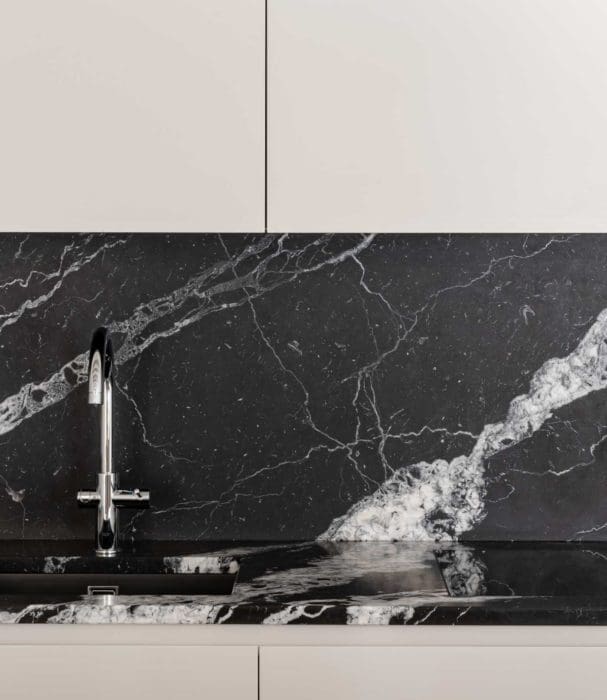 Le marbre toujours et encore, pare la cuisine ainsi qu’une des quatre salles de bains. Son noir profond est animé de veinures contrastées. Ici, le marbrier a habillé avec élégance la crédence et le plan de travail.