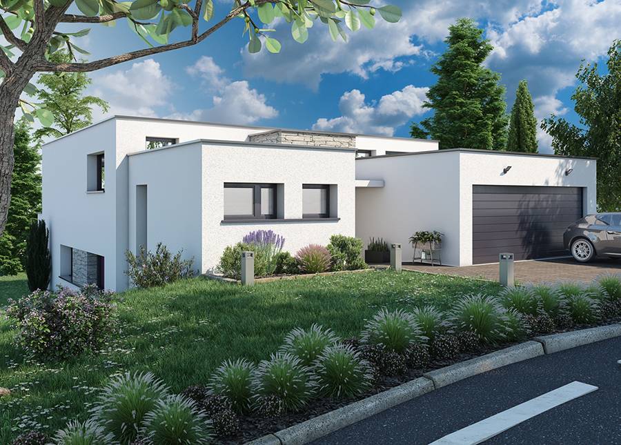 Reliefs et volumes. La villa, dotée d’un grand garage, est facile d’accès. Ses menuiseries gris-noir, l’utilisation d’enduits de façade de couleurs subtilement contrastées, blanc craie ou gris, mariés aux parements en pierre naturelle font de l’effet au premier regard.