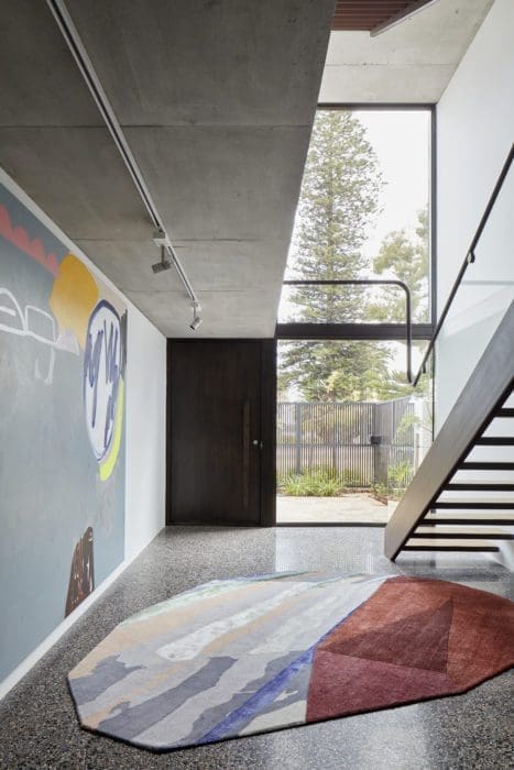 C’est ainsi qu’il y a quelques mois, State of Kin se lance, sans commanditaire, dans la construction d’une résidence à Wembley sur les bords du lac Monger ceint de splendides forêts. Un environnement grandiose mais un terrain très pentu qui oblige à trouver des solutions architecturales de haute volée pour combler les dénivelés : des différences de niveaux, des vides, des pièces étroites dédiées à la contemplation jouxtant les pièces de vie, plus grandes, plus dynamiques. « N’ayant personne pour nous imposer ses diktats, ses goûts, nous étions libres », précisent Ara et Alessandra. Les deux designers ne devaient néanmoins pas perdre de vue que, pour réussir à vendre cette demeure, elles devaient séduire un panel d’acheteurs potentiels assez vaste. Leur cahier des charges, loin d’être utopique et poétique, était donc spéculatif et flexible.