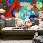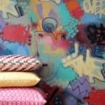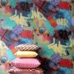 La complicité entre l’artiste graffeur et Pierre Frey est aujourd’hui à l’origine d’une collection inattendue, d’un tissu, d’un papier peint et d’un panoramique aux couleurs vives et aux formes abstraites réalisées à la bombe.