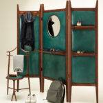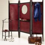 Le paravent se décline en 4 coloris (cerise, gris, vert bouteille et bleu) et s’équipe d’étagères, patères et d’un miroir rond au cadre cuivré. La chaise quant à elle, dispose d’une assise en cuir Berluti qui viendra accueillir pantalon, chemise, veste, pull ou sac à la tombée de la nuit…