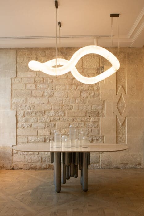 Cette nouvelle pièce vient d’être dévoilée à l’occasion de Paris Déco Home et trône au-dessus d’une table de Mickael Koska, sélectionnée par l’architecte d’intérieur Caroline Andreoni, au sein du nouveau lieu d’Atelier Alain Ellouz. Après la Fondation pour l’albâtre, à Bièvres, le designer inclassable s’est en effet offert un écrin rive gauche à l’automne dernier. Empreints de minéralité, ces 270 m2 abritant les vestiges de l’ancienne église du couvent des Grands Augustins sont le terrain de jeu idéal pour marier art, design et architecture, à travers une programmation pointue… et poursuivre une quête d’absolu.