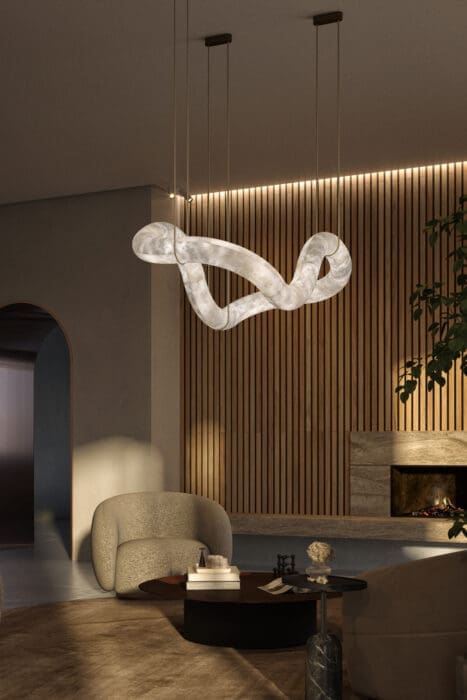 Aérien, tout en nuances translucides, le modèle « Vague », ruban de Möbius sculptural aux ondulations poétiques inspirées par le ressac, prolonge logiquement Infinity, la collection iconique de luminaires en albâtre d’Atelier Alain Ellouz.
