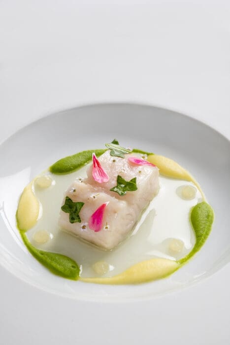 Posez dans les assiettes chaudes une portion de merlu, parsemez de feuilles d’huître et fleurs de sureau et de géranium. Dessinez une quenelle de purée de pomme de terre, de petits pois et de condiment bergamote. Versez au fond de l’assiette