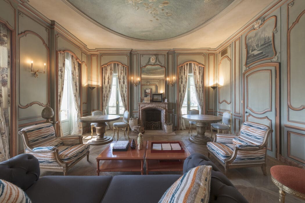 La famille Vranken, propriétaire de ce domaine, a entrepris une restauration d’envergure du château pour lui redonner son caractère d’élégante gentilhommière et proposer aux visiteurs de la découvrir pour mieux appréhender son terroir et ses vins. Les meilleurs artisans ont été choisis pour, pièce par pièce, corps de métier par corps de métier, intervenir. Décorateur, maçon, carreleur, tapissier, ébéniste, marbrier, peintre, électricien, se sont succédé, avec fierté et compétence, s’appliquant à respecter l’existant tout en magnifiant l’architecture et les intérieurs exceptionnels. Trois ans de chantier pour tout reprendre, de la cave à la toiture aux tuiles romanes cylindriques en terre cuite, dont la légende assure que les femmes les moulaient sur leurs cuisses. Deux étages recomposés : le rez-de-chaussée avec son enfilade de pièces de réception, et le premier, plus intime, que dessert un bel escalier orné de fresques. Deux étages où le mobilier remis en état se marie avec des pièces de collection glanées par la famille.