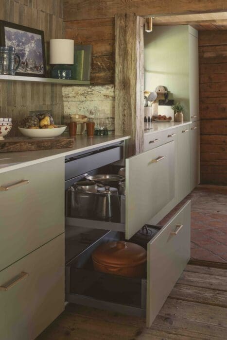 Cuisiner en profitant du panorama exceptionnel de la montagne environnante a constitué un challenge relevé avec maestria par Sarah Poniatowski. Une imposante cuisinière Godin voisine avec une armoire de rangement avec tiroirs à l’anglaise, indispensable pour stocker les produits secs et en vrac. L’espace lavage est matérialisé par un linéaire qui accueille un évier en céramique encastré sous le plan en quartz Pierredeplan Recycle coloris Atlas ; le réfrigérateur, quant à lui, s’est glissé entre le mur et la fenêtre.