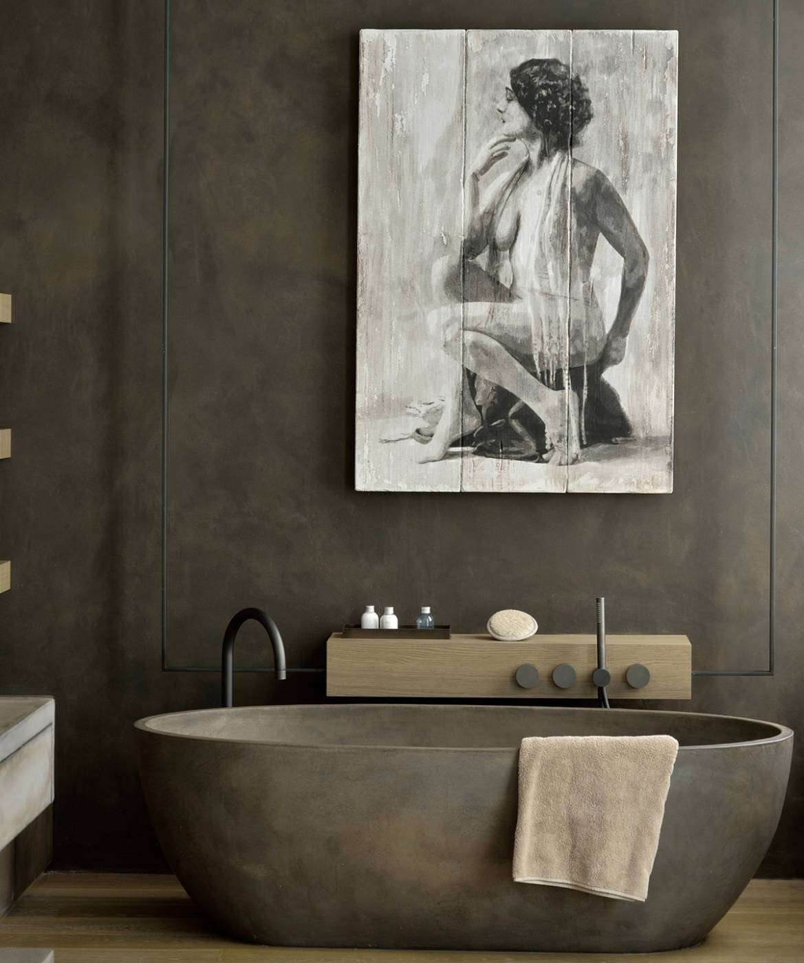 La baignoire ovoïde (Aquamass) a également été recouverte de tadelakt pour se fondre dans ce décor de terre et de sable. Tableau par Yz, street artist parmi les plus actives ; parquet en chêne massif, Nobel Flooring.