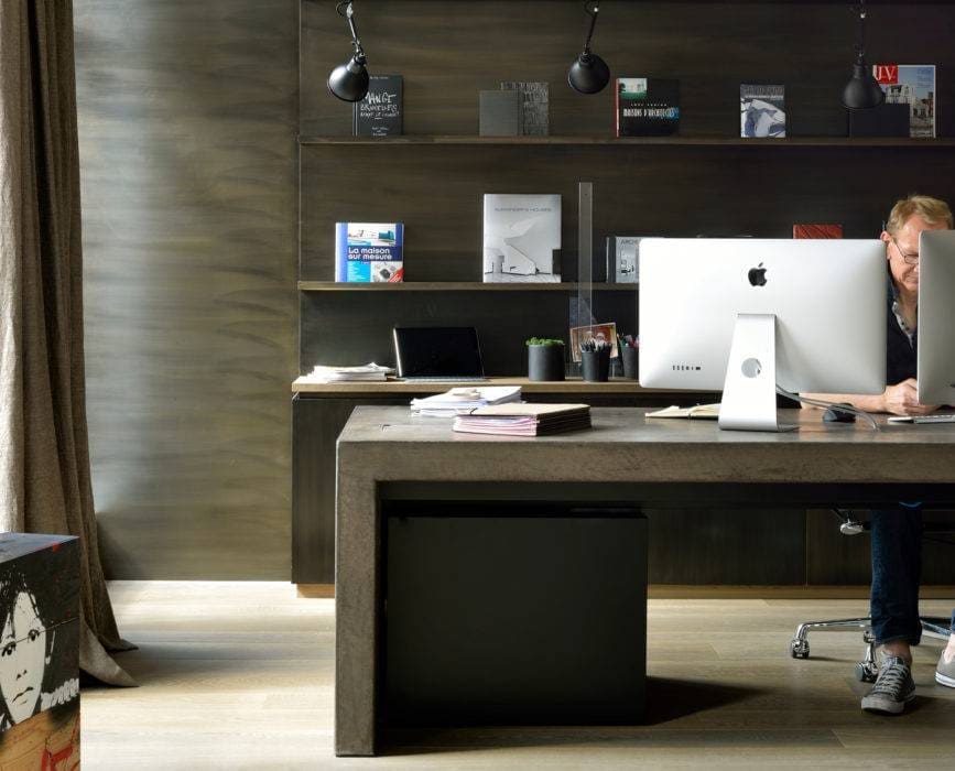 Entre street-art et matériaux bruts, tous les codes de la demeure se transposent dans le bureau d’Arnaud Masson. Table de travail, fabriquée sur mesure par Recob et recouverte de tadelakt par Odilon Creations. Étagères en chêne et acier brut, Recob ; parquet en chêne fumé, Nobel Flooring ; lampes noires suspendues, « Gras », DCW Editions.