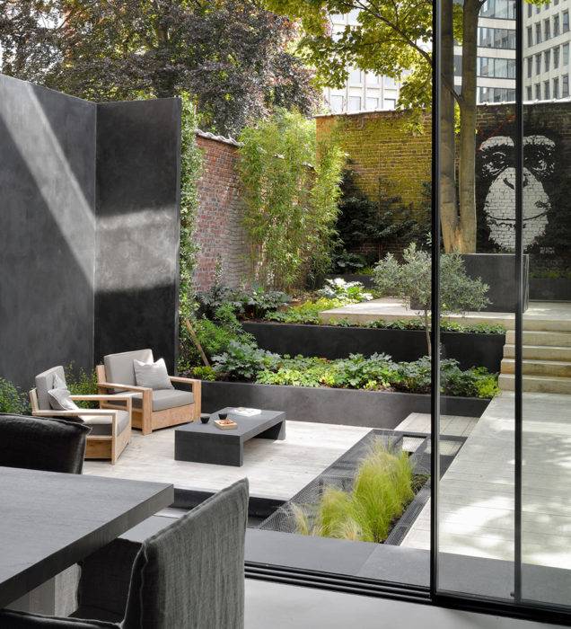 Le jardin à deux niveaux, issu de trois parcelles différentes, a été recomposé en conservant les grands arbres d’origine. Le toit-terrasse est semé de graminées et d’une sculpture. Fauteuils et table d’extérieur Maisons du Monde ; chaises Fermob ; plateaux à plantes en