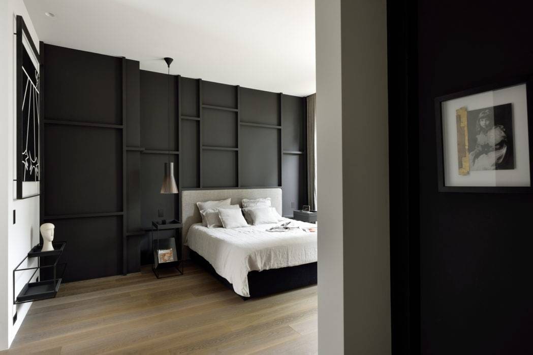 Dans la chambre principale, donnant sur le toit végétalisé, le mur noir mat structure l’espace. Il est recouvert de panneaux en MDF façonnés sur mesure par Recob. L’entreprise de menuiserie belge signe également les chevets et la commode, dessinés par Arnaud Masson et K2A. Parquet en chêne massif, Nobel Flooring ; suspension Secto Design ; rideaux Casamance ; linge de lit en lin, Blanc Cerise.