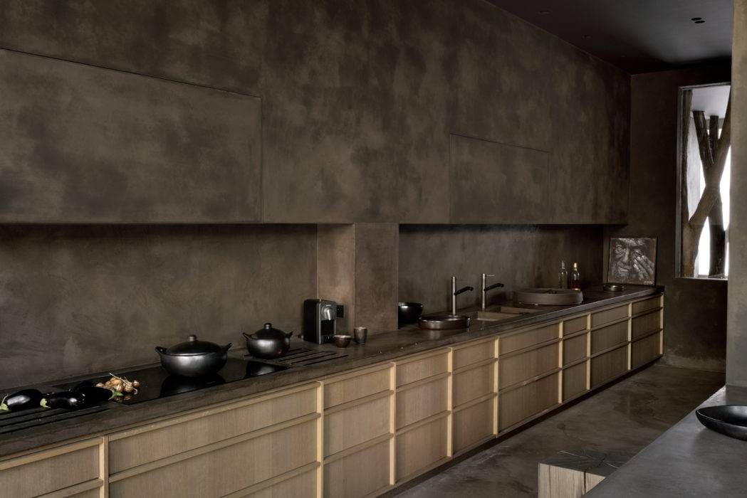 Même dans la cuisine, le traitement de la crédence, des murs et du sol, avec leur texture fascinante et leur palette de tons peu ordinaires, participe à l’atmosphère chaleureuse quoiqu’un brin mystérieuse. Ultime fantaisie, les ustensiles et appareils électroménagers sont de la partie, s’affichant fièrement en noir. Tadelakt, plâtre d’argile et Pastellone, Odilon Creations ; menuiserie en chêne, dessinée par Arnaud Masson et K2A et fabriquée par Recob.