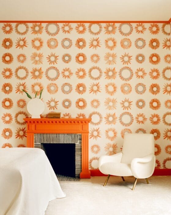 Papier peint « Sunny » de Victoria-Maria pour Pierre Frey. Fauteuil Zanuso vintage, années 1950. Luminaire Hollandery.