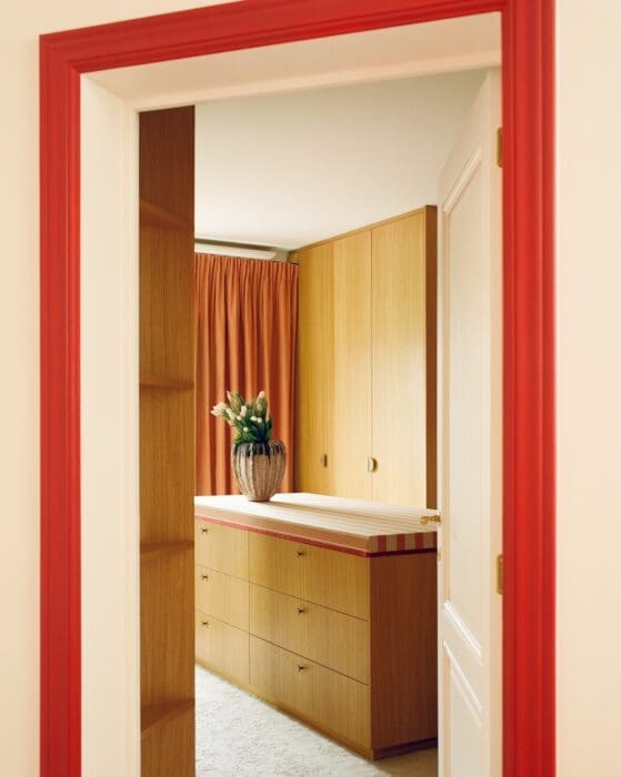 ON S’APPRÊTE ? Dans le dressing, vraie pièce pour elle et lui. Coiffeuse en tissu Jane Churchill, réalisée par Mazarine Diana. Poignées en laiton. Seuils de porte peints dans une teinte rose-orange. Vase Asiatides.