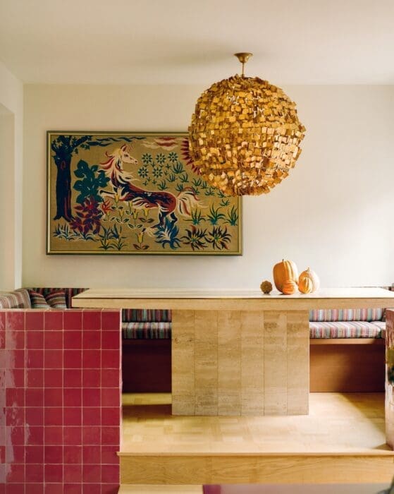 BREAKFAST EN CUISINE ? Les uns et les autres s’y succèdent, au rythme de leurs activités. Muret en zelliges, table vintage en travertin. Tapisserie achetée chez un antiquaire parisien. Suspension Labyrinth.